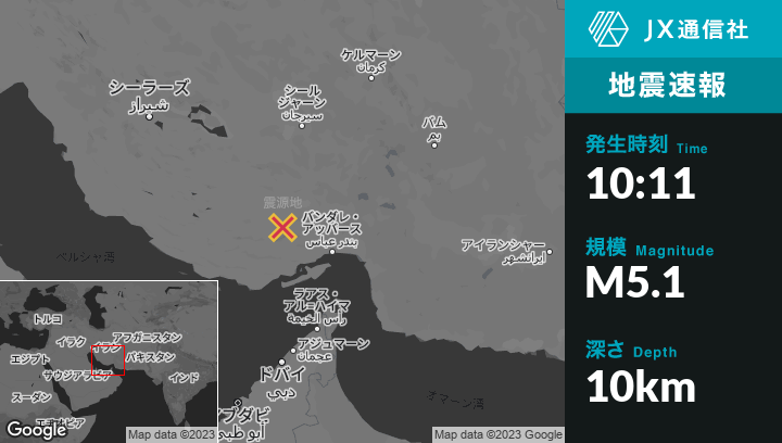2月22日 10:11頃、イランのGerāshから東113kmの地点でM5.1の地震がありました。