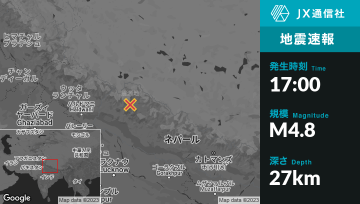2月22日 17:00頃、ネパールのJumlaから北西68kmの地点でM4.8の地震がありました。