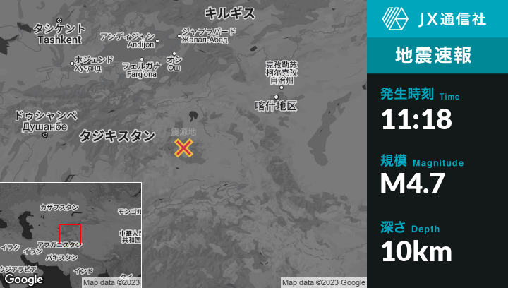 2月23日 11:18頃、タジキスタンのMurghobから西北西77kmの地点でM4.7の地震がありました。
