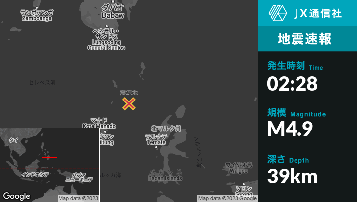 2月25日 02:28頃、ライキット II (ディメンベ)、インドネシアのLaikitから北東197kmの地点でM4.9の地震がありました。