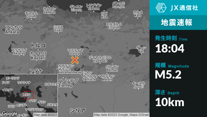 2月27日 18:04頃、トルコのYeşilyurtから南南東8kmの地点でM5.2の地震がありました。