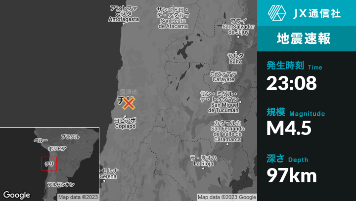 2月27日 23:08頃、チリのDiego de Almagroから南南西44kmの地点でM4.5の地震がありました。