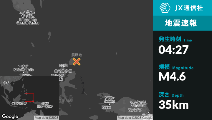 | 震源地 | インドネシアのTobeloから北東115kmの地点 |
