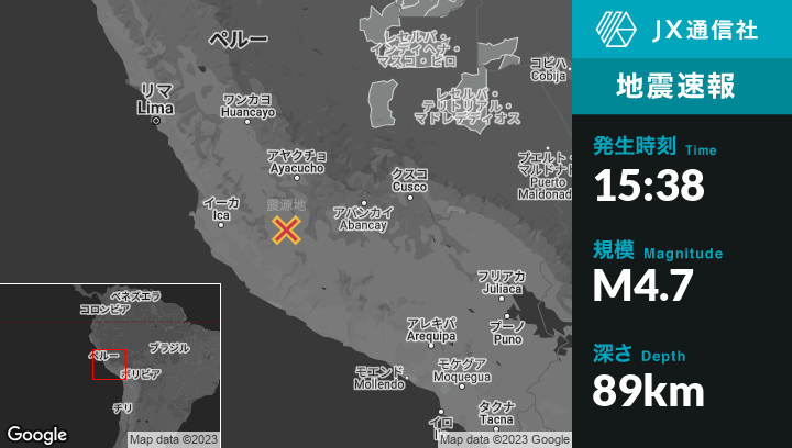 3月29日 15:38頃、ペルーのSacsamarcaから南西17kmの地点でM4.7の地震がありました。