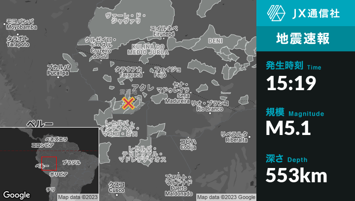 | 震源地 | ブラジルのMarechal Thaumaturgoから東南東156kmの地点 |