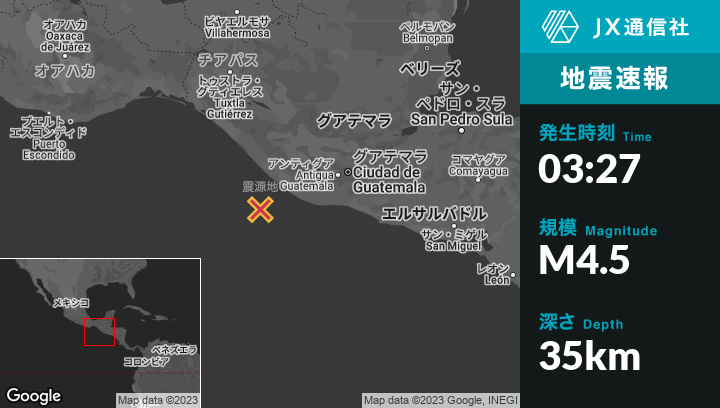 4月10日 03:27頃、グアテマラのOcósから南南西68kmの地点でM4.5の地震がありました。