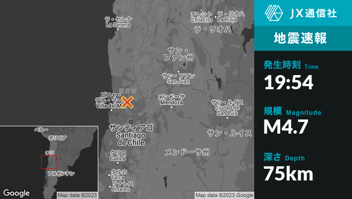 4月10日 19:54頃、チリのSan Felipeから北北西20kmの地点でM4.7の地震がありました。