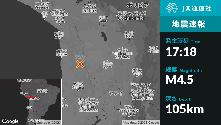 4月13日 17:18頃、チリのIquiqueから東南東144kmの地点でM4.5の地震がありました。