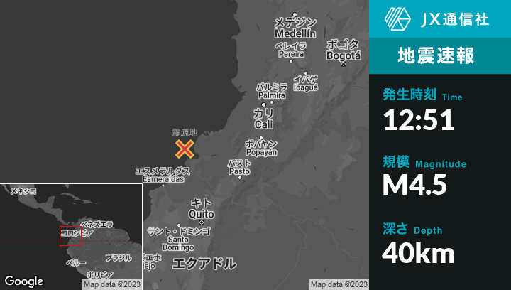 4月15日 12:51頃、コロンビアのSalahondaから西北西42kmの地点でM4.5の地震がありました。