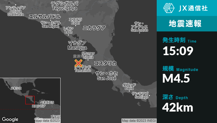 4月18日 15:09頃、コスタリカのSardinalから西55kmの地点でM4.5の地震がありました。