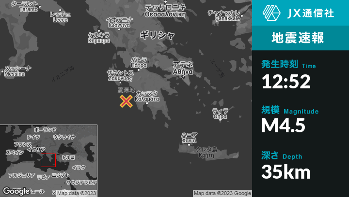4月19日 12:52頃、ギリシャのFiliatráから西38kmの地点でM4.5の地震がありました。