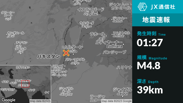 4月24日 01:27頃、パキスタンのKot Adduから南南西13kmの地点でM4.8の地震がありました。