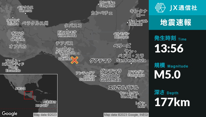 5月06日 13:56頃、メキシコのNueva Américaから南西8kmの地点でM5.0の地震がありました。