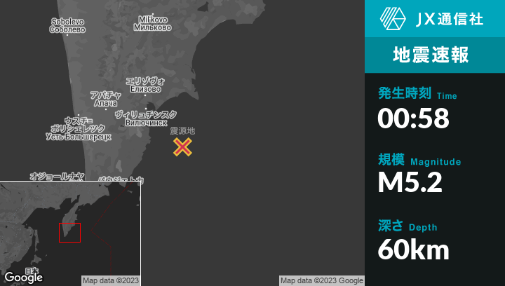 5月07日 00:58頃、ロシアのVilyuchinskから南東105kmの地点でM5.2の地震がありました。