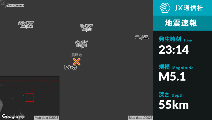 5月08日 23:14頃、トンガのKolongaから北北東63kmの地点でM5.1の地震がありました。