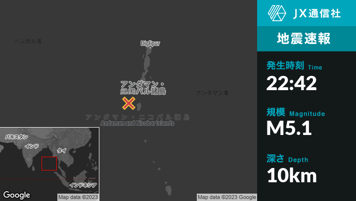 5月09日 22:42頃、インドのPort Blairから南西110kmの地点でM5.1の地震がありました。