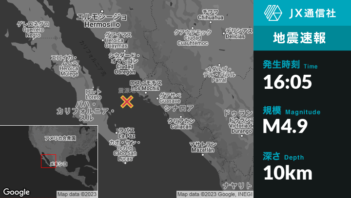 5月10日 16:05頃、メキシコのCampo Pesquero el Coloradoから西南西57kmの地点でM4.9の地震がありました。