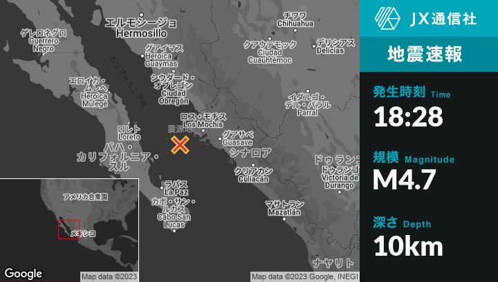 5月10日 18:28頃、メキシコのCampo Pesquero el Coloradoから南西49kmの地点でM4.7の地震がありました。