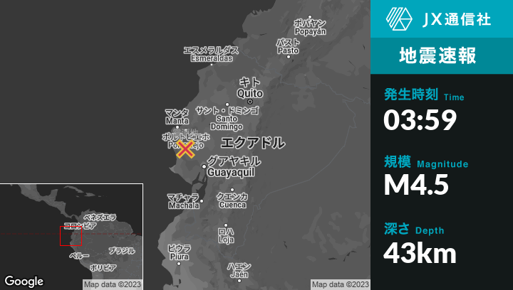 5月14日 03:59頃、エクアドルのPajánから北西6kmの地点でM4.5の地震がありました。