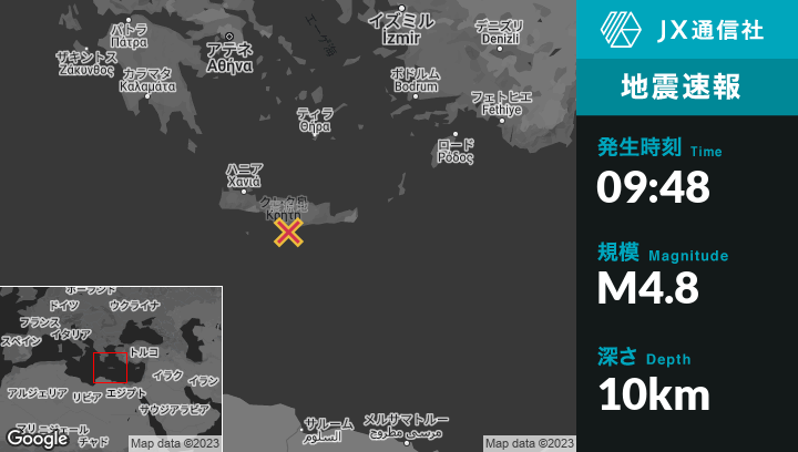 5月20日 09:48頃、ギリシャのMoíresから南11kmの地点でM4.8の地震がありました。
