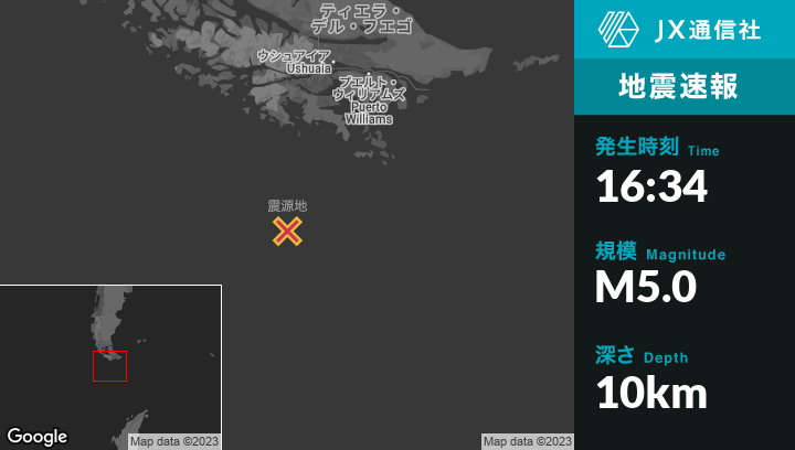 5月20日 16:34頃、アルゼンチンのUshuaiaから南南西210kmの地点でM5.0の地震がありました。
