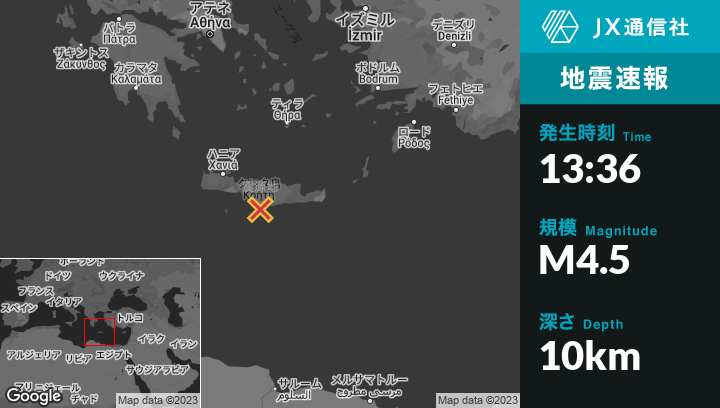 5月21日 13:36頃、ギリシャのMoíresから南南西10kmの地点でM4.5の地震がありました。