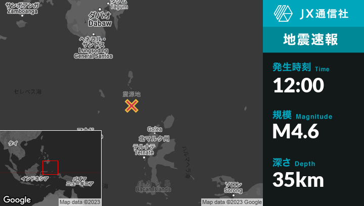 5月22日 12:00頃、インドネシアのTobeloから北西203kmの地点でM4.6の地震がありました。