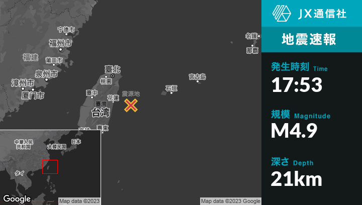 10月05日 17:53頃、台湾のHualien Cityから東76kmの地点でM4.9の地震がありました。