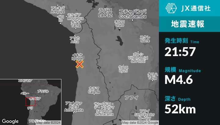 10月04日 21:57頃、チリのAlto Hospicioから東南東13kmの地点でM4.6の地震がありました。