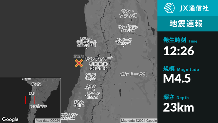10月06日 12:26頃、チリのSan Antonioから西南西52kmの地点でM4.5の地震がありました。