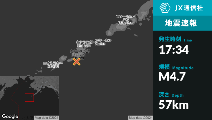 | 震源地 | アラスカのUnalaskaから南南西70kmの地点 |
