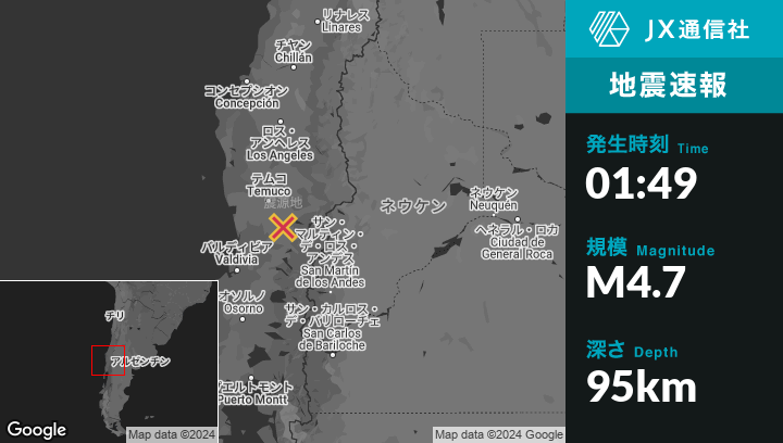 12月25日 01:49頃、チリのVillarricaから北北西25kmの地点でM4.7の地震がありました。