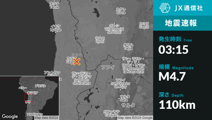| 震源地 | チリのCalamaから北東48kmの地点 |
