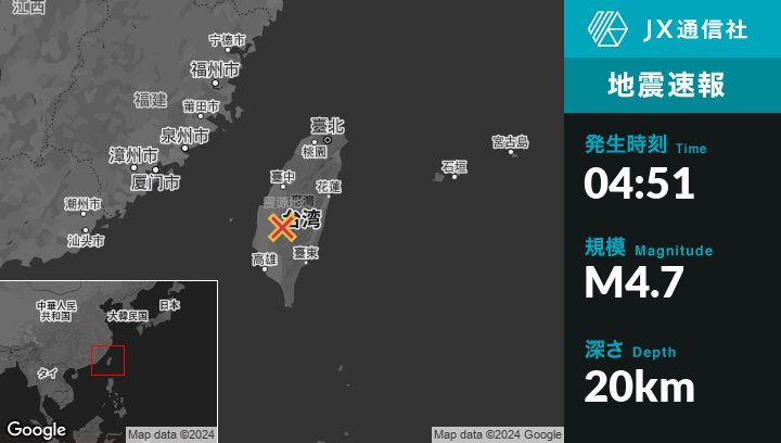 12月30日 04:51頃、台湾のPizitouから東北東21kmの地点でM4.7の地震がありました。