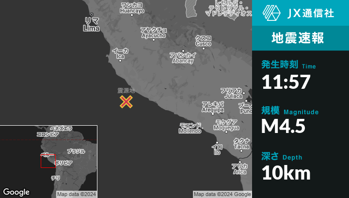 12月31日 11:57頃、ペルーのSan Juanから南西53kmの地点でM4.5の地震がありました。