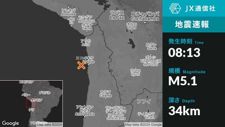 1月01日 08:13頃、チリのPuertoから西50kmの地点でM5.1の地震がありました。