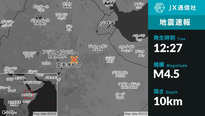 1月01日 12:27頃、エチオピアのĀwashから北西25kmの地点でM4.5の地震がありました。