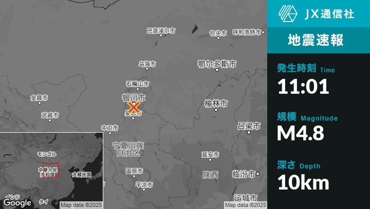 1月02日 11:01頃、中国のYinchuanから西南西4kmの地点でM4.8の地震がありました。