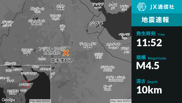 | 震源地 | エチオピアのDebre Sīnaから南南東52kmの地点 |
