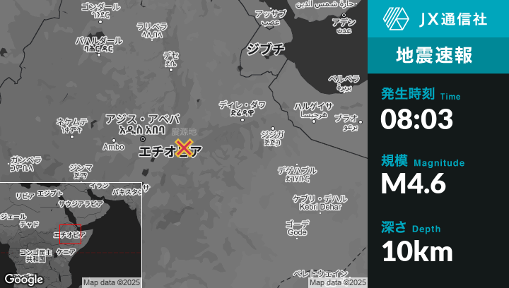 | 震源地 | エチオピアのMetahāraから東南東12kmの地点 |