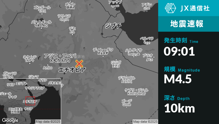 | 震源地 | エチオピアのĀwashから北24kmの地点 |