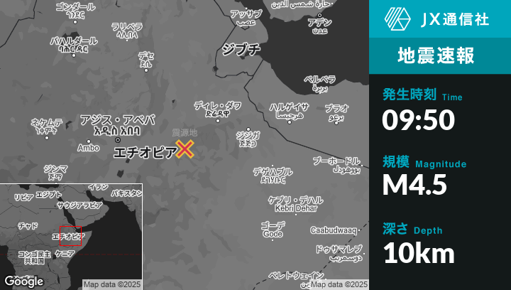 1月06日 09:50頃、エチオピアのBedēsaから南東6kmの地点でM4.5の地震がありました。