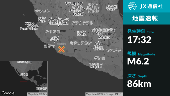 1月12日 17:32頃、メキシコのCoalcomán de Vázquez Pallaresから南東8kmの地点でM6.2の地震がありました。