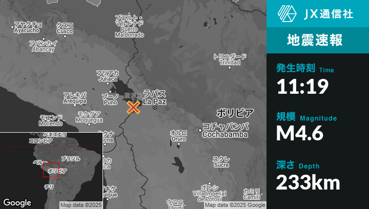 1月18日 11:19頃、ペルーのYunguyoから南南東12kmの地点でM4.6の地震がありました。