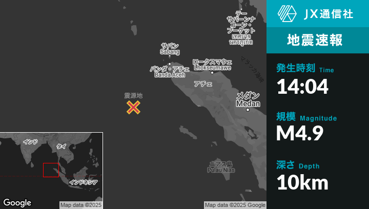 | 震源地 | インドネシアのBanda Acehから南西258kmの地点 |