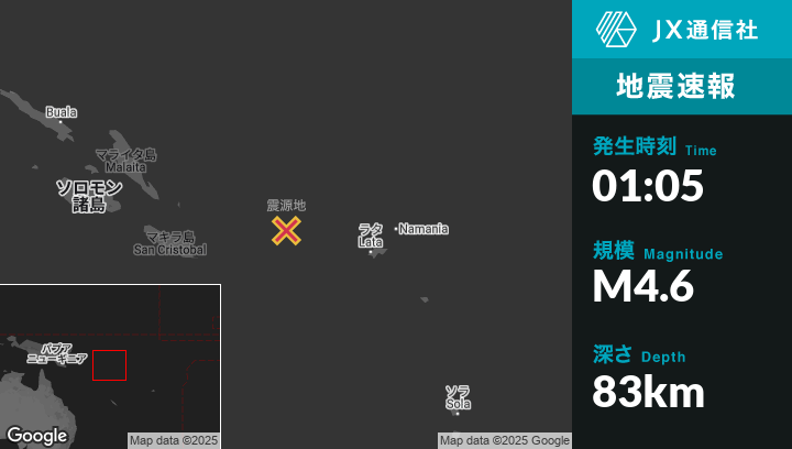 1月25日 01:05頃、ソロモン諸島のLataから西北西194kmの地点でM4.6の地震がありました。