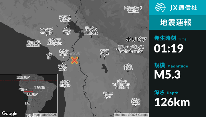 1月25日 01:19頃、ペルーのPalcaから東南東68kmの地点でM5.3の地震がありました。