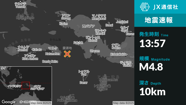 | 震源地 | インドネシアのFakfakから南西127kmの地点 |