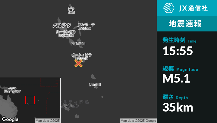 | 震源地 | バヌアツのPort-Vilaから西24kmの地点 |