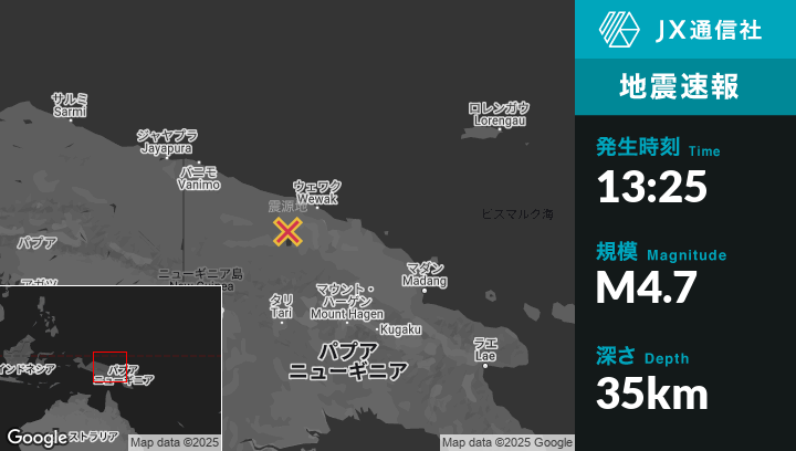2月25日 13:25頃、パプアニューギニアのAmbuntiから北東43kmの地点でM4.7の地震がありました。